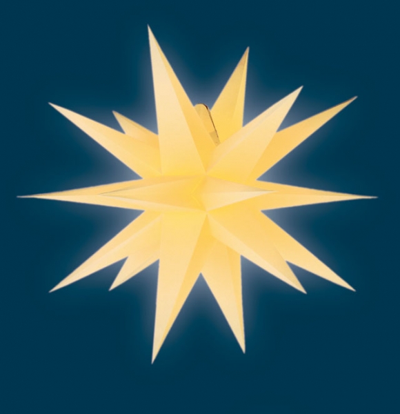 Im Jahre 1924 erfand der Kartonagenfabrikant Karl Friedrich den zusammenlegbaren Adventsstern aus Papier, der bald als „Friedrich-Stern“ bekannt wurde. Seit 1926 ist der Faltstern patentrechtlich geschützt. Damals wie heute gibt es die beiden Sterngrundformen in vielen verschiedenen Größen und Farben zur weihnachtlichen Gestaltung unserer Räume in der Adventszeit. In den Wohnungen und besonders in den Kinderzimmern sollten die Sterne leuchten und zusammen mit Engel und Bergmann die Weihnachtszeit ankündigen. In liebevoller Handarbeit werden die Faltsterne hergestellt und Jahr für Jahr an Kunden in der ganzen Welt verschickt. Die Einfachheit des Auffaltens der Sterne macht sie im Besonderen beliebt. Der Stern wird an den beiden Verschlusspappen erfasst und vorsichtig aufgespannt. Den Stern nun um die Fassung hängen, die beiden Metallklemmen schließen und schon kann er im weihnachtlichen Glanz erstrahlen.