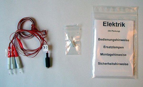 Inklusive Trafo mit 1,5 m Kabel, Beleuchtung 3 x 12 V/0,1 A und 2,5 m Kabel und Ersatzlampe